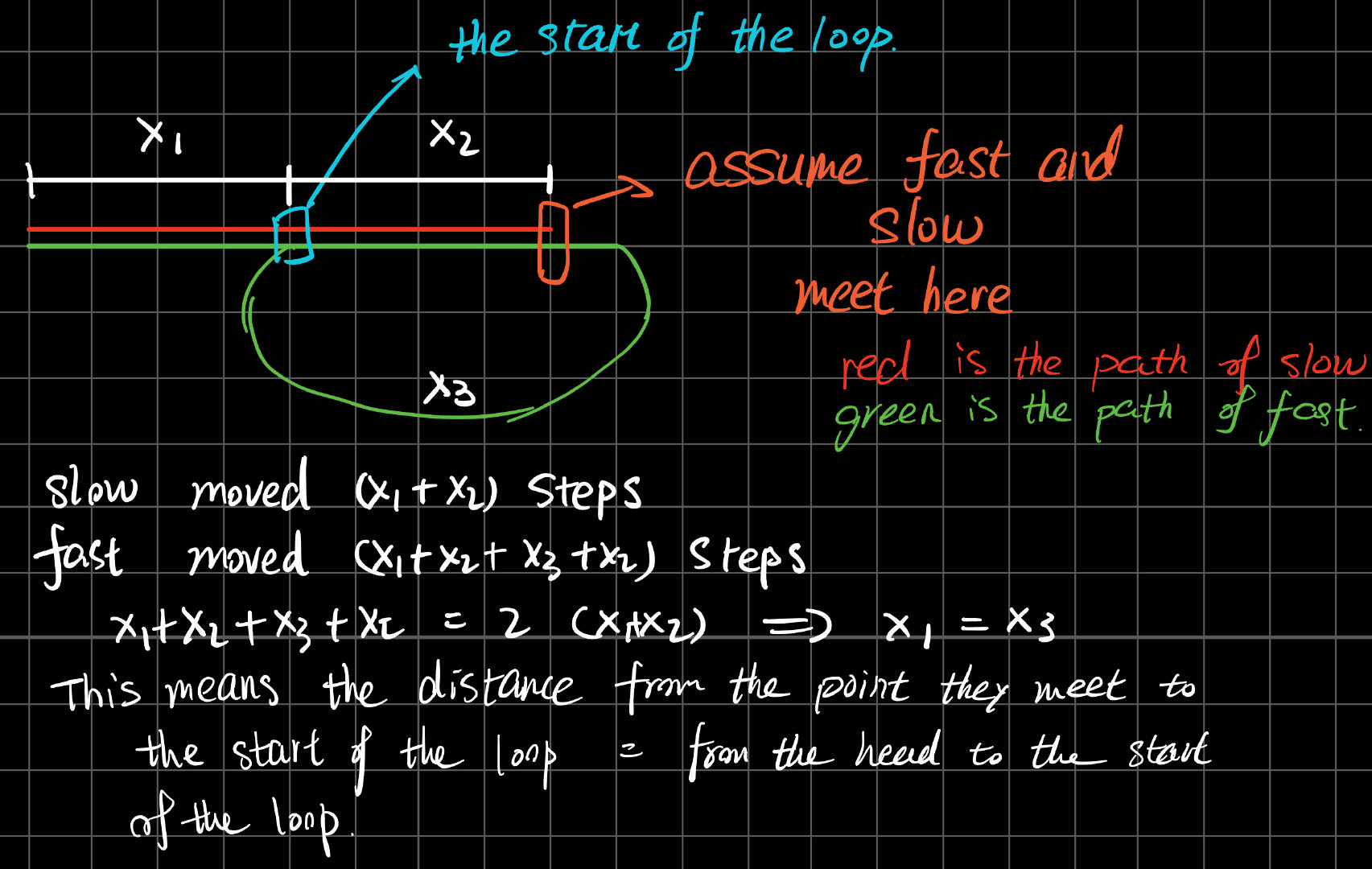 - 画图进行数学推导(参见下图,可以发现此时只需要在快慢指针相遇的时候,利用x1==x3,从LL到head再起一个指针按照同样的速度与slow指针一起同时往前走,当他们相遇的时候,就是相遇的地方)